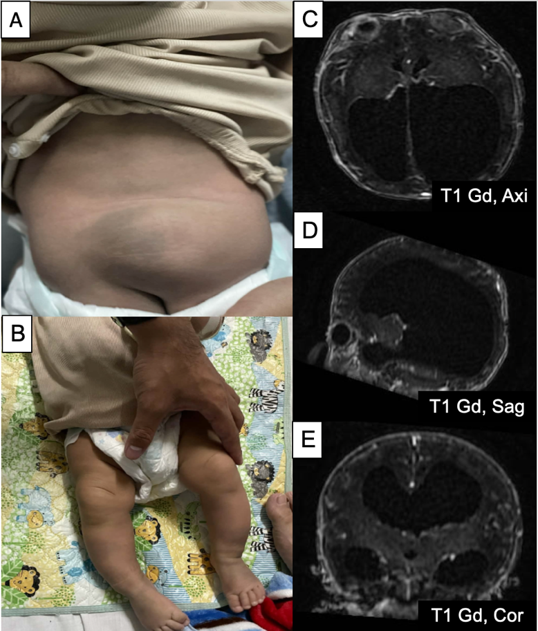 Hình 1. Hình ảnh khối thoát vị vùng cột sống thắt lưng cùng, hình vòm, bờ rõ, 5x7cm, phần da bao phủ còn nguyên vẹn (A), bàn chân khoèo (B), hình ảnh giãn não thất trên MRI chuỗi xung T1 Gado ở mặt phẳng cắt ngang (C), đứng dọc (D), đứng ngang (E)