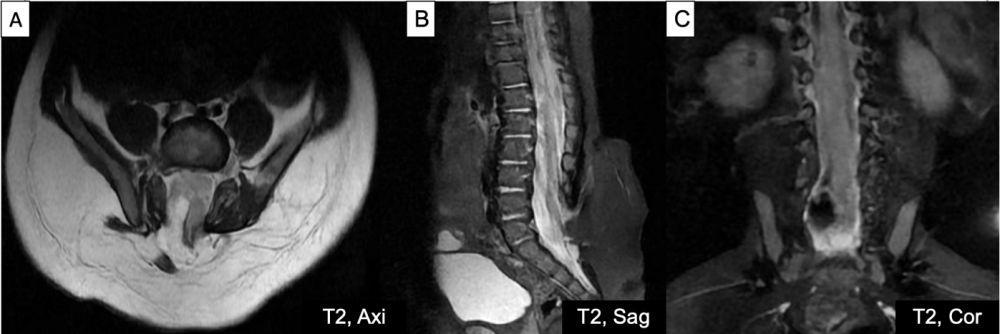 Hình 2. Cộng hưởng từ cột sống thắt lưng chuỗi xung T2 trên mặt phẳng cắt ngang, đứng dọc, đứng ngang (A-C) với khuyết cung sau các đốt sống cùng S1-S3, kèm túi thoát vị màng tủy chứa mô mỡ liên tục với mỡ dưới da, bên trong chứa mỡ và một phần tủy sống; đường kính cổ túi thoát vị #20mm, chóp tủy nằm thấp ngang mức S1.