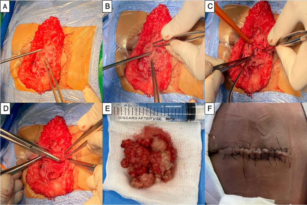 Hình 3. Hình ảnh trong mổ với khối mô mỡ được giải khối, tách lớp màng cứng tuỷ thành 2 lớp (A-C) và đưa tuỷ vào trong đóng túi màng cứng (D), mô mỡ thừa được loại bỏ (E), đóng vết mổ theo các lớp giải phẫu (F).