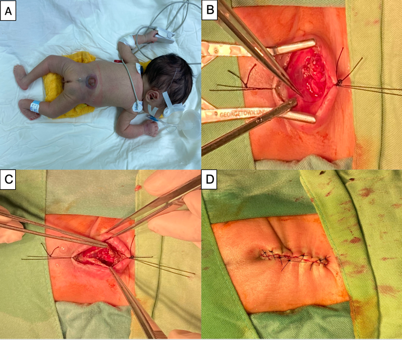Hình 4. Hình ảnh trong mổ thoát vị myelomeningocele chảy dịch não tuỷ và bàn chân khoèo (A), khối thoát vị được phẫu tích và tách 2 lớp màng cứng tuỷ và lớp mô dưới da (rất mỏng) (B, C) sau đó tiến hành đưa tuỷ vào trong và đóng túi màng cứng và đóng vết mổ (D)