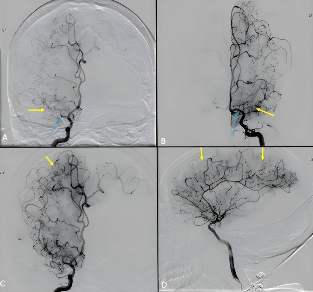 Hình 2. Chụp mạch máu số hoá xoá nền (DSA) với hẹp tắt động mạch não giữa đoạn M1 (mũi tên xanh) bên phải (A), bên trái (B) và các mạch máu Moyamoya (mũi tên vàng)