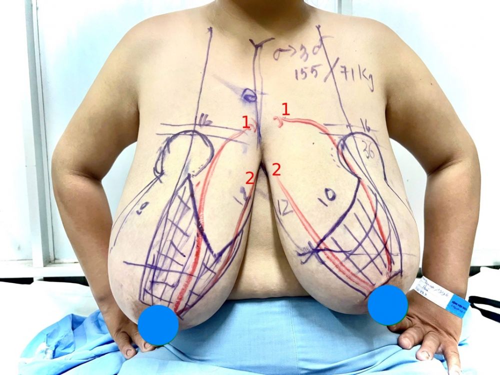 1. Trước mổ: Siêu âm doppler và chụp MSCT , xác định vị trí động mạch vú trong, cuống mạch trên và trên - giữa của động mạch vú trong  nuôi quầng núm vú . Đánh giá chất lượng mạch. Dựa vào cuống mạch đã xác định để thiết kế vạt cuống vú theo hình chữ T ngược. ( hình 1 và hình 2)