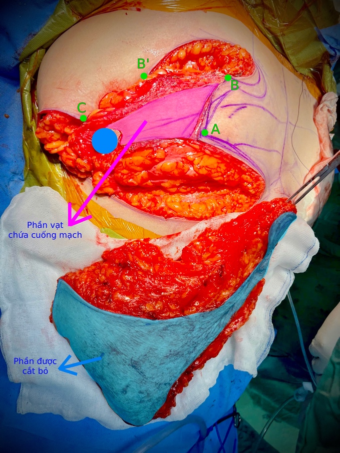Hình 2. Phần vạt chứa cuống mạch được bảo tồn, loại bỏ lớp da.Quầng núm vú được đưa lên vị trí BB’.  Sau mổ, AB và B’C được khâu lại với nhau, tạo thành đường nối quầng núm vú – chân ngực.