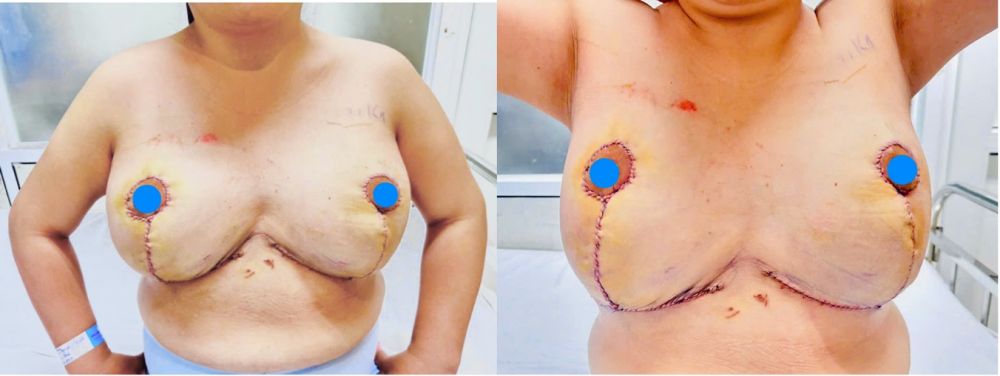 Kết quả: sau 8 ngày phẫu thuật thu gọn vú. Thể tích hai vú, khuôn ngực, chân ngực 2 bên vú cân đối, quầng núm vú hồng ấm, vết mổ khô. Bệnh nhân ổn định và đang được tiếp tục theo dõi và phục hồi. (hình 5)