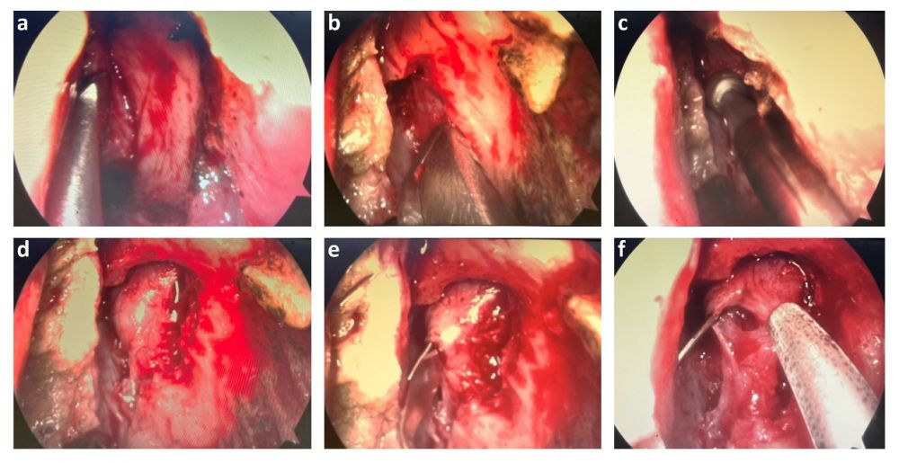 Hình 1. Các bước tiến hành phẫu thuật mở thông túi lệ mũi. a, Lật vạt niêm mạc thành bên mũi; b, Bộc lộ ống lệ mũi bằng Kerrison; c, Khoan bộc lộ túi lệ mũi và tế bào Ager nasi; d, Lấy bỏ các thành ống xương quanh túi và ống lệ mũi; e, Rạch túi lệ theo định hướng que thăm dò; f, Mở rộng túi lệ mũi và ống lệ mũi