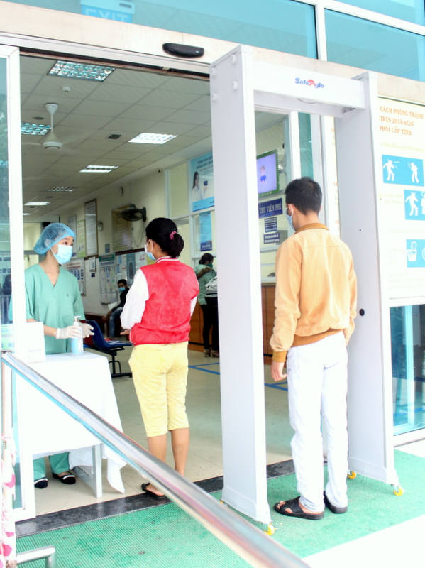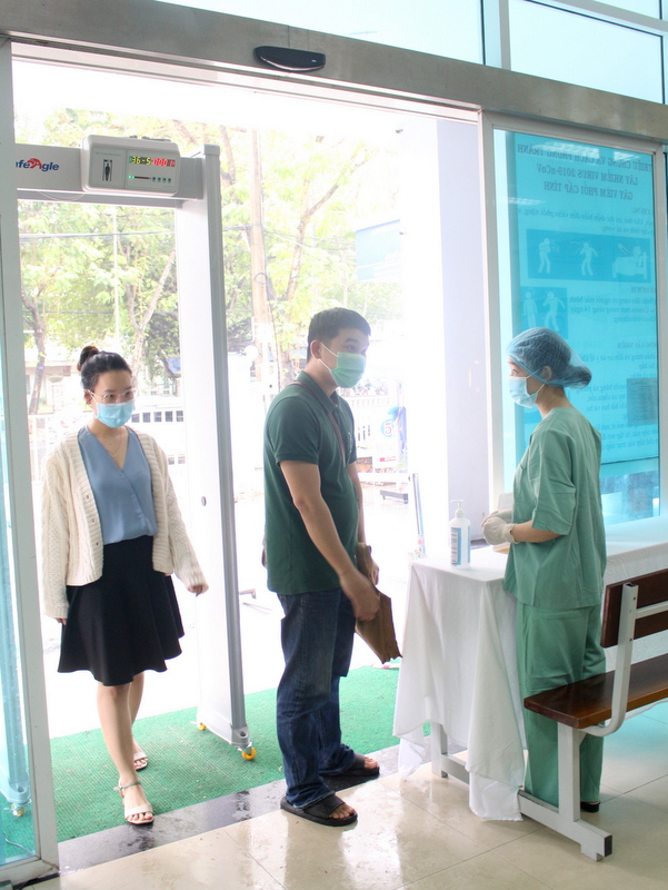Người dân đến Bệnh viện Trường đi qua máy đo nhiệt độ cơ thể không tiếp xúc, sau đó được nhân viên y tế kiểm tra triệu chứng hô hấp và yếu tố dịch tễ