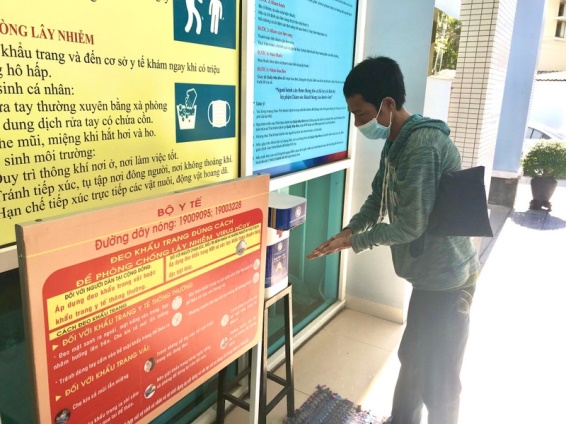 Người bệnh, người nhà bệnh nhân đến khám tại Bệnh viện Trường Đại học Y Dược Huế làm khai báo y tế, rửa tay sát khuẩn trước lúc vào Bệnh viện