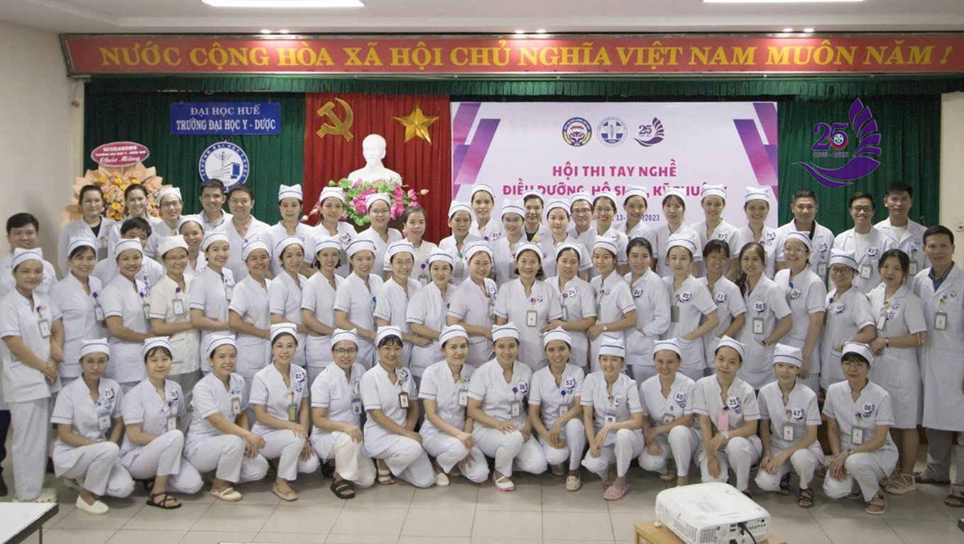 Trong ngày 13/10/2023, vòng thi Thực hành và Lý thuyết Hội thi tay nghề Điều dưỡng, Hộ sinh, Kỹ thuật y năm Bệnh viện Trường ĐHYD Huế 2023 đã diễn ra tại Hội trường 101.Trãi qua vòng thi cấp khoa, 60 thí sinh được chọn tham gia vòng thi cấp bệnh viện, tuy nhiên có 01 thí sinh vắng mặt do ốm đột xuất. Buổi sáng, 59 thí sinh đã hoàn thành 06 trạm thực hành chạy trạm gồm 04 trạm thực hành gồm thay băng, truyền dịch, thông tiểu, cấp cứu ngừng tuần hoàn và 02 trạm xử lý tình huống về phản vệ, báo động đỏ và cấp cứu ngừng tuần hoàn hô hấp; riêng khối kỹ thuật y thay 02 trạm thực hành bằng 02 kỹ thuật chuyên khoa thực hiện trên người bệnh và máy tại khoa. Buổi chiều các thí sinh hoàn thành phần thi lý thuyết gồm các kiến thức chuyên ngành, quy chế chuyên môn.