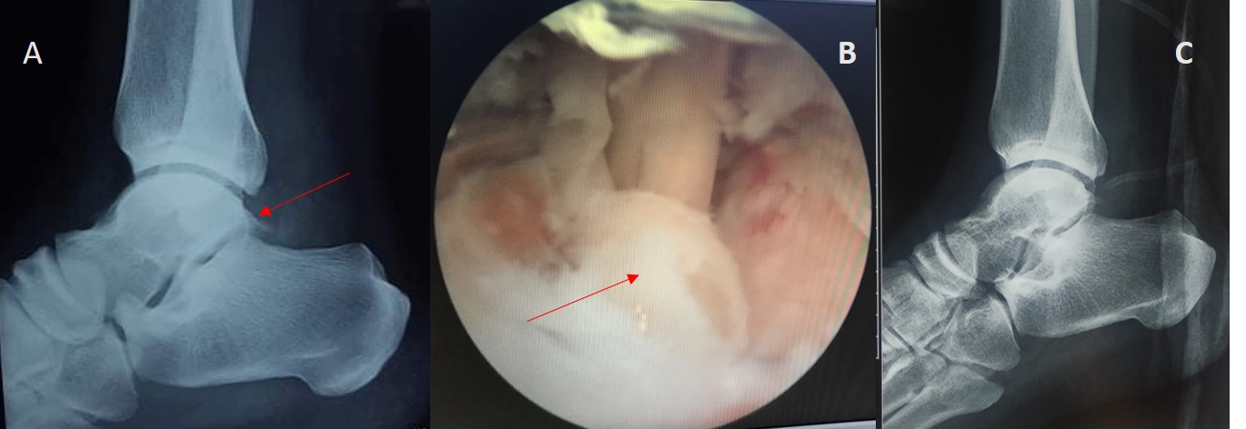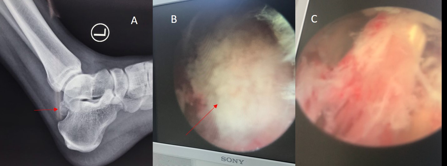 A & B: Khối gai xương sau xương sên trên X quang trước mổ và hình ảnh nội soi trong mổ (mũi tên đỏ)